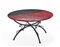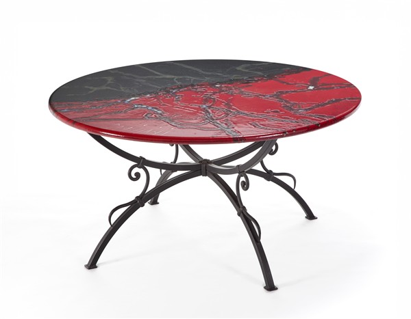 Tavolo con piano tondo in pietra laccato a gran fuoco con decoro informale color rosso e nero. Struttura in ferro forgiato. Torgiano (PG), anni '90/2000. (h cm 76; d cm 148,5)