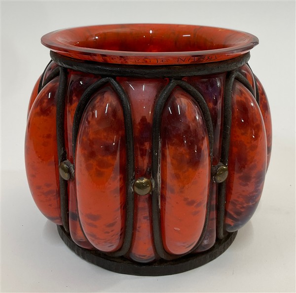 Vaso in vetro maculato e baccellato con gabbia in ferro forgiato. Nancy, 1925ca. Firmato Delatte. (h cm 12,5) (difetti)
