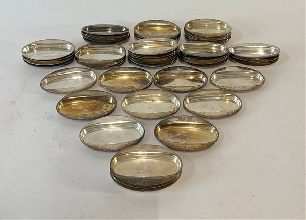 Quarantacinque piattini. Italia, anni '40/'50. Metallo argentato. Marcati a incussione sotto la base. (cm 7x10) (lievi difetti)