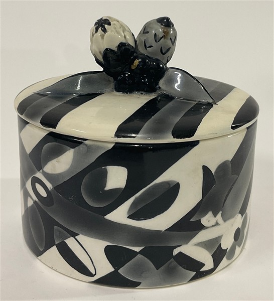 Scatola di forma circolare in ceramica smaltata bianca nera e grigia decorata a motivi floreali geometrici. Presa del coperchio a forma di bacche. Torino, 1934. Firmata e iscritta sotto la base "Lenci MADE IN ITALY 11-34-XIII". (h cm 12; d cm 12,5) (lievi difetti)