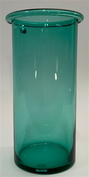 Vaso cilindrico in vetro soffiato verde trasparente modello "Juno". Esecuzione Nuutajarvi, Finlandia, anni '90. (h cm 29,5)