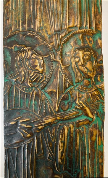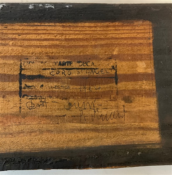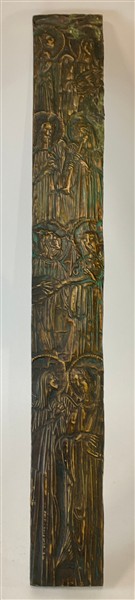 Pannello raffigurante coro di angeli. Torino, 1964. Marcato, datato e firmato al retro. (cm 13,5x119,5) (difetti e restauri)