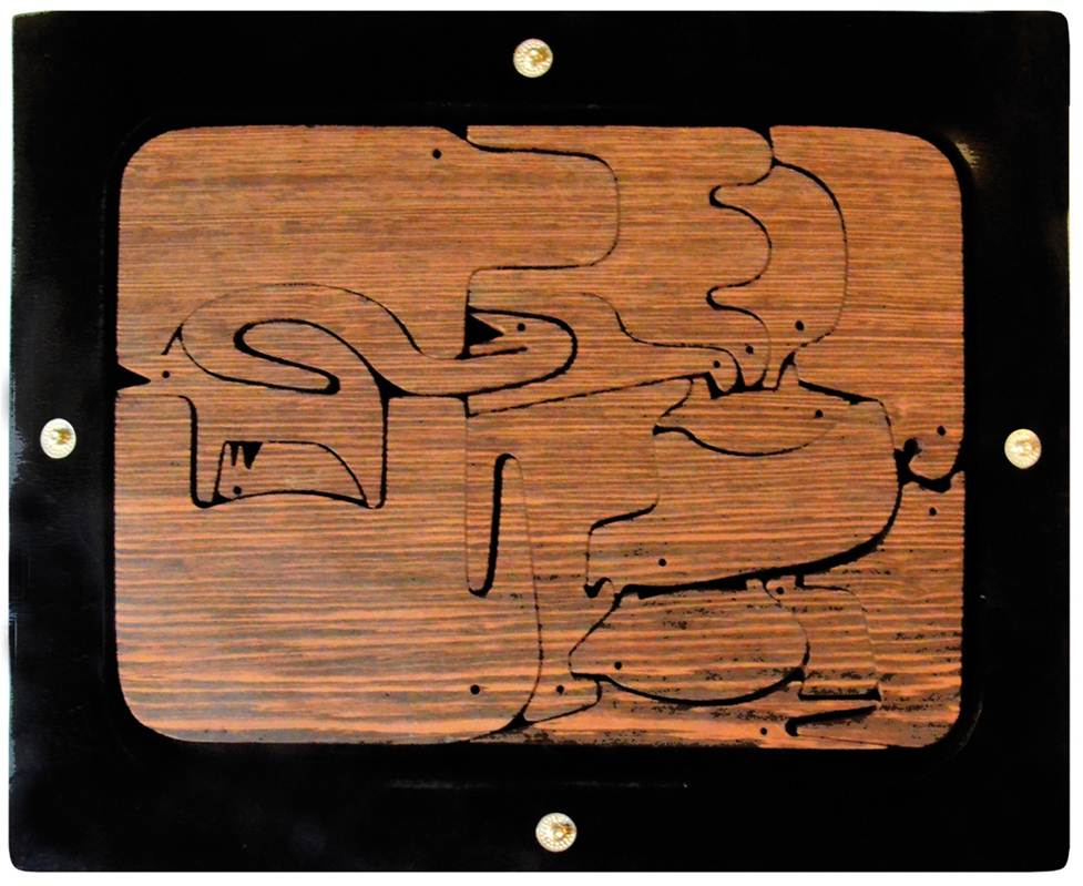 Enzo Mari (Novara, 1932) Gioco 3015B Sedici animali Produzione: Danese, 1959 Elementi in palissandro con contenitore in acetato e bottoni a scatto. Rara variante del modello di maggiore dimensione cm 1,5 h x 15 x 21