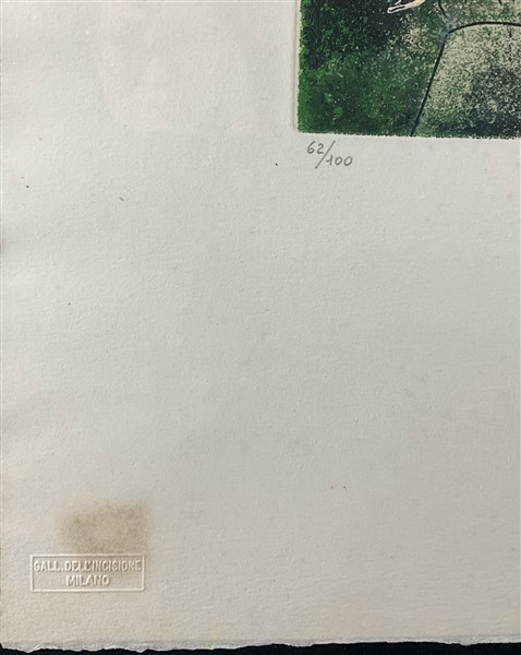firmato e numerato 62/100 in basso a matita, timbri a secco della Galleria dell'Incisione, Milano e Georges Visat Editions d'art in basso. In cornice (difetti)