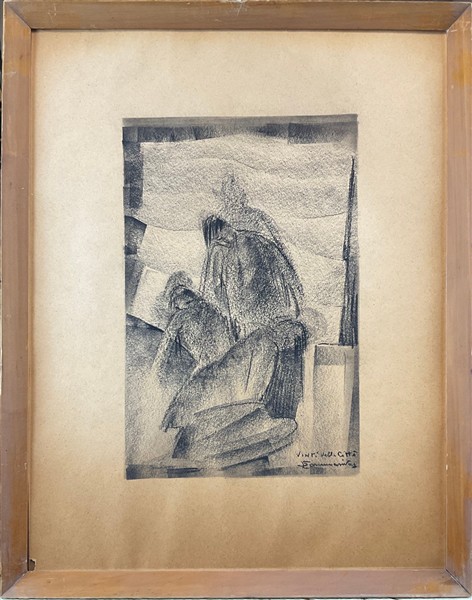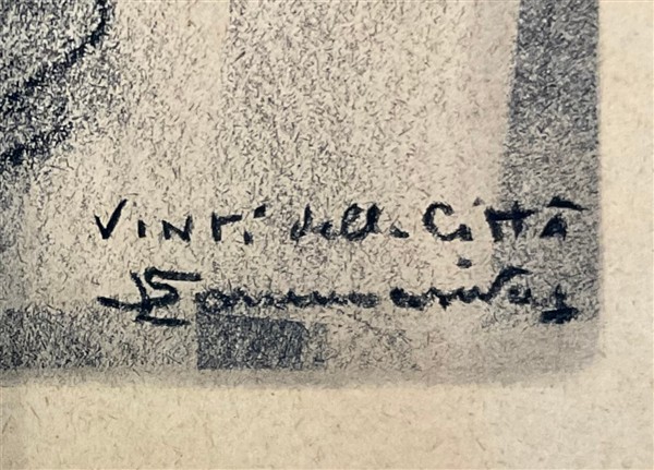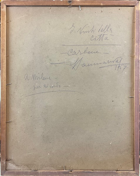 i monotipi firmati e datati 1959 in basso, il carboncino firmato e titolato "Vinti della città" in basso a destra e titolato, firmato e datato 1957 al retro. In cornici (difetti)