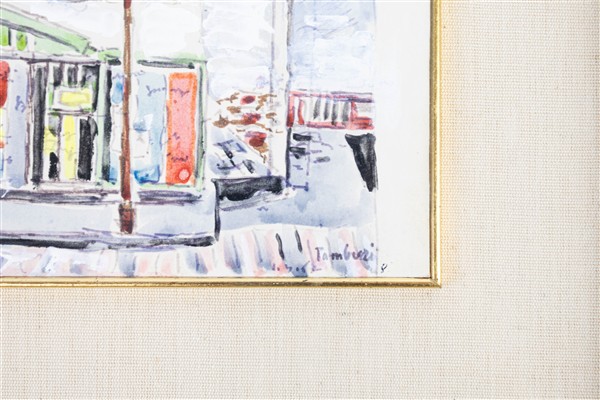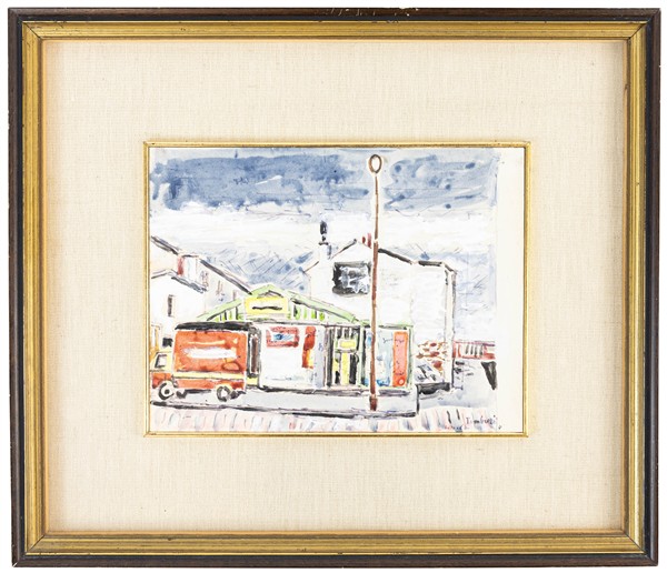 Orfeo Tamburi "Muri e camion alla Chapelle" 1967 tecnica mista su carta cm 17x22