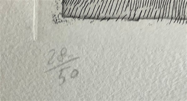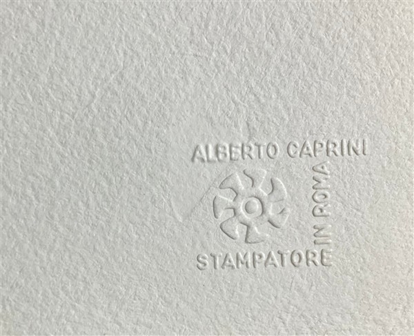 firmato, datato e numerato 28/50 in basso a matita; timbro a secco Alberto Caprini Stampatore in Roma in basso a destra (lievi difetti)