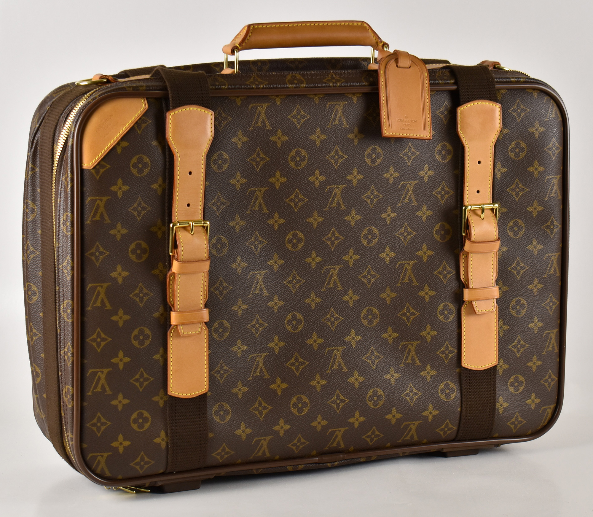Valigia in tela Monogram. Finiture in pelle zip e fibbie in metallo dorato interno foderato con tascone e due cinghie. Lucchetto con chiave. Tracolla marrone regolabile con finiture in pelle e parti metalliche dorate. Etichetta in pelle 'Louis Vuitton Paris Made in France' e Data Code (MB0919).
