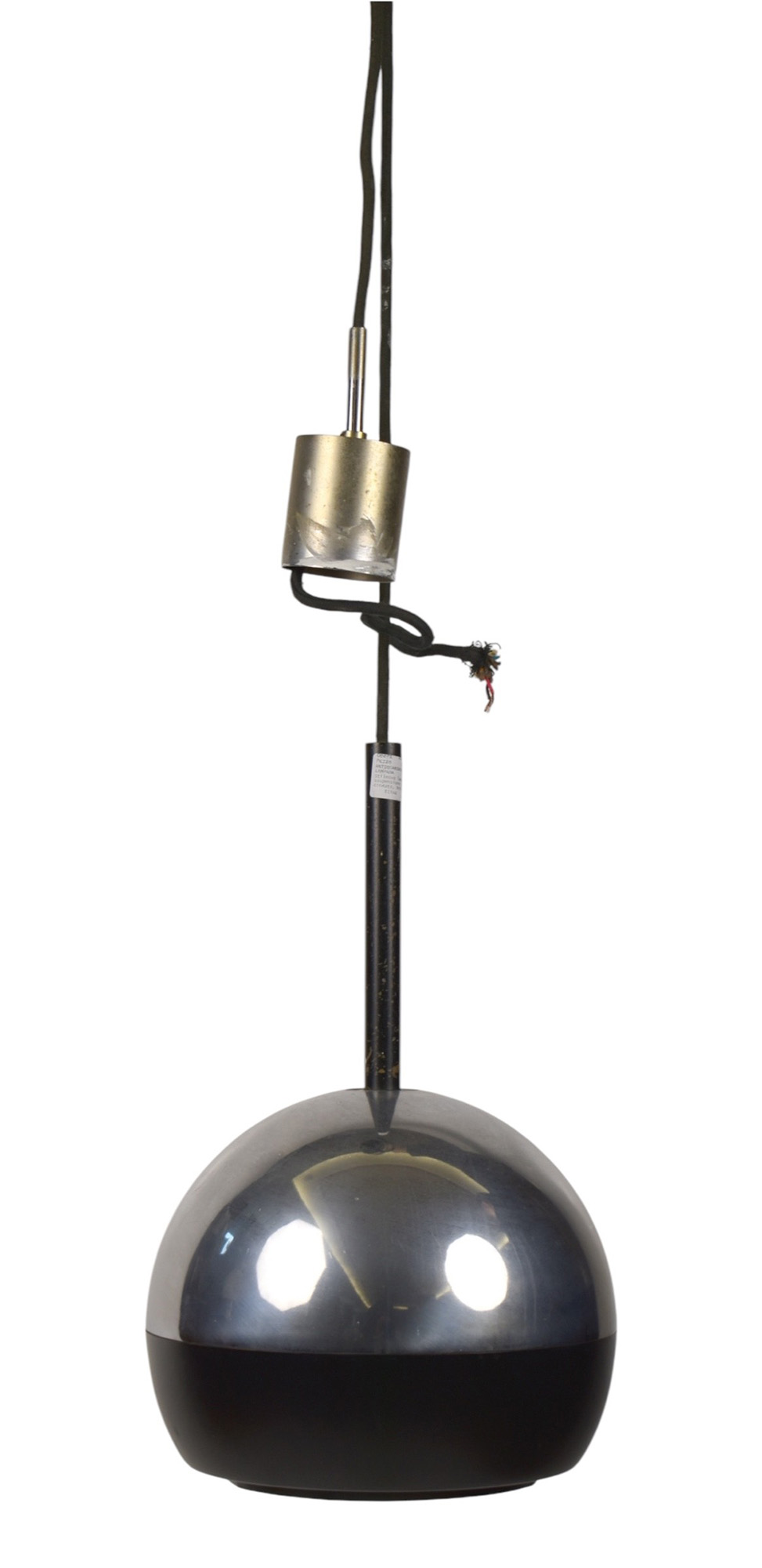 Lampada a sospensione in ottone cromato metallo verniciato.
