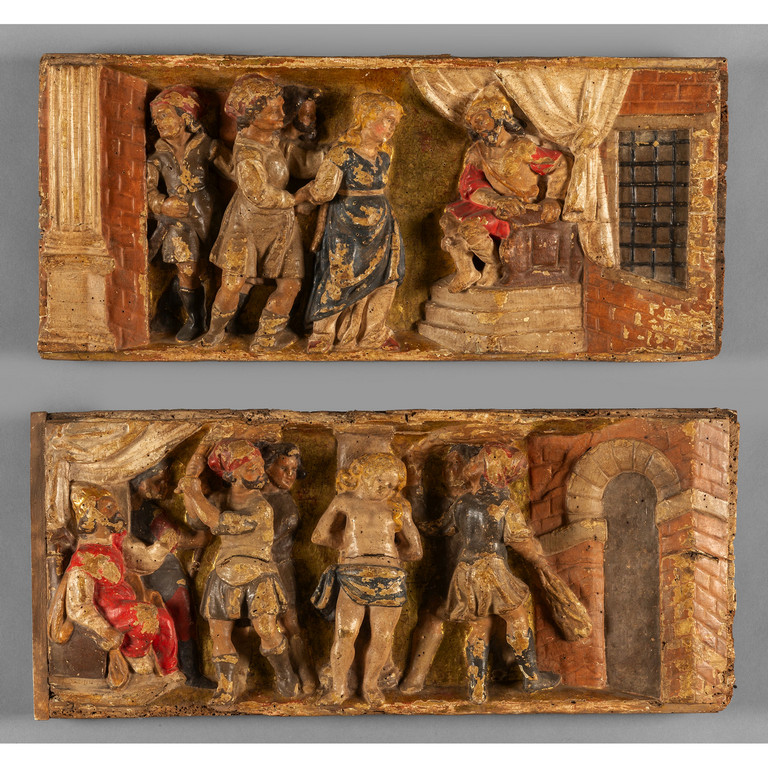 Scene bibliche coppia di bassorilievi in legno finemente intagliato dorato e policromato Spagna sec.XVII