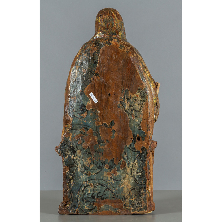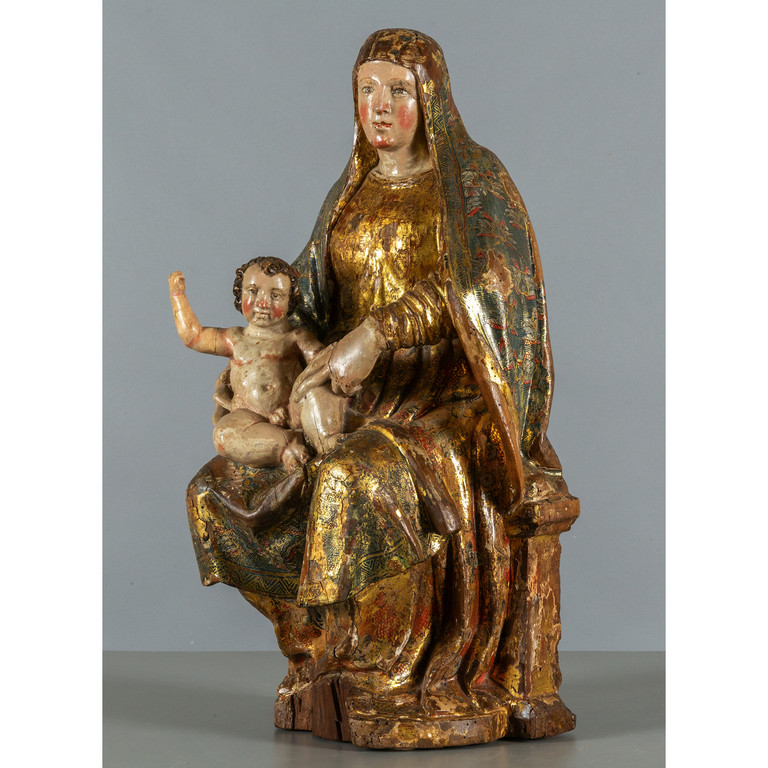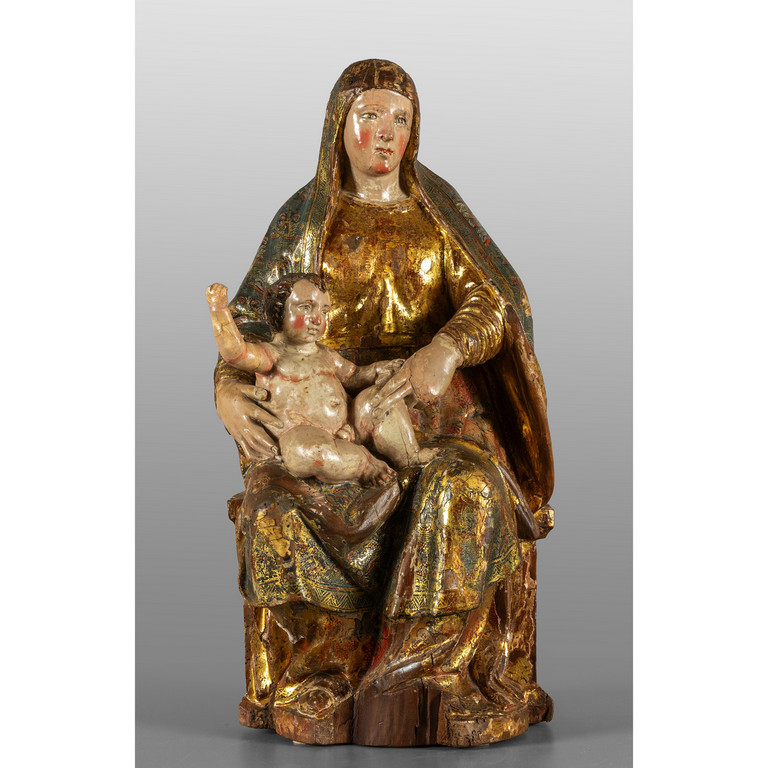 Madonna con Bambino in trono scultura in legno intagliato dorato e laccato con tecnica incisoria a estofado Lombardia inizi sec.XVI