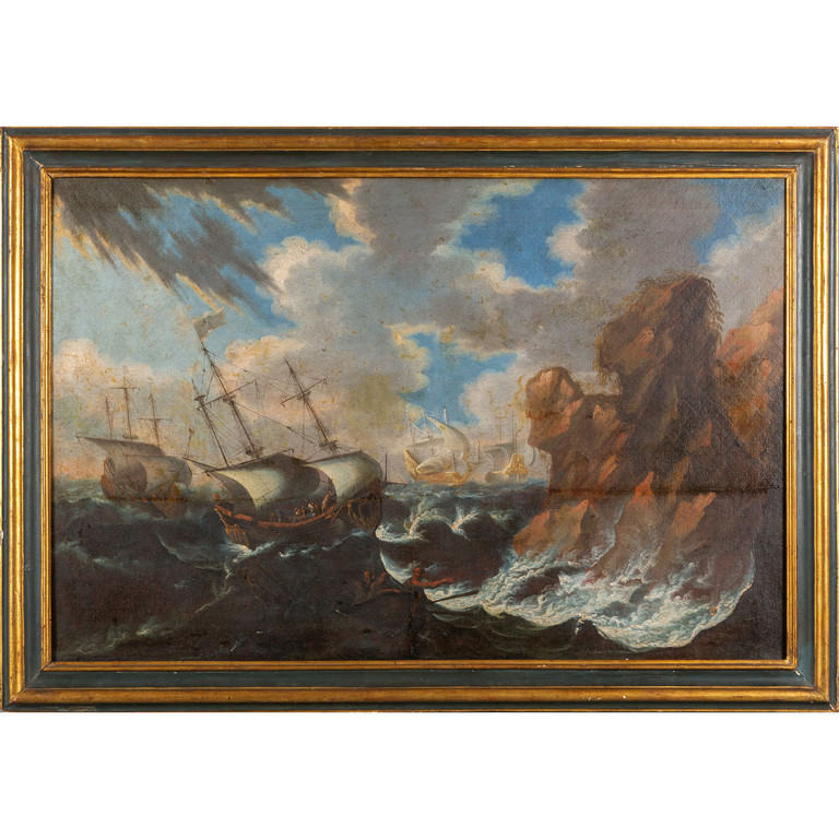 Scuola fiamminga sec.XVIII 'Navi nella tempesta' olio