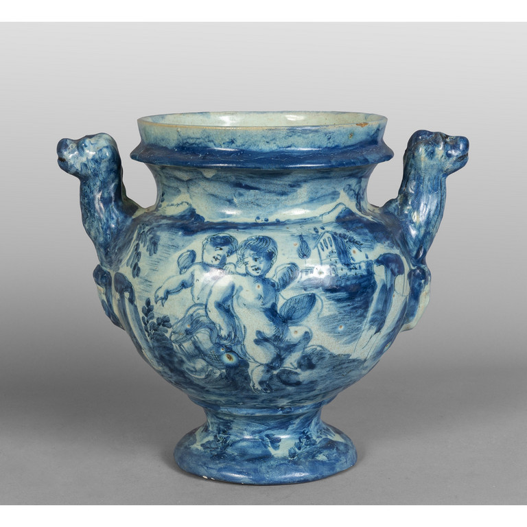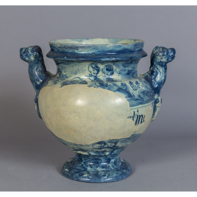 Vaso con manici in ceramica a decorazione bianca e blu marca Lanterna Savona sec.XVIII