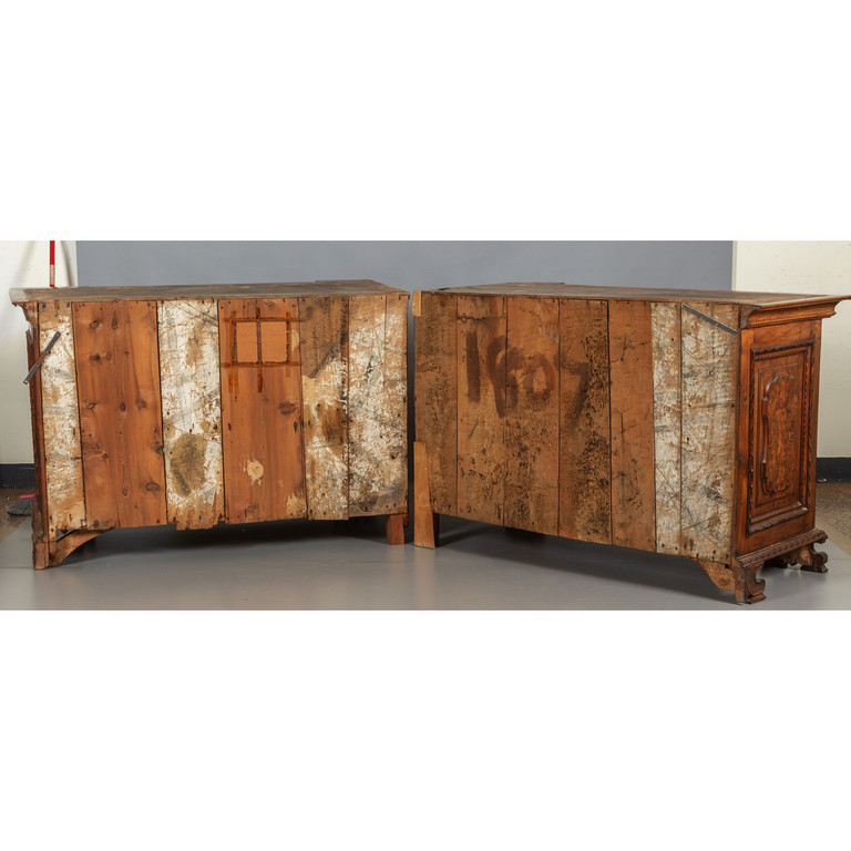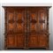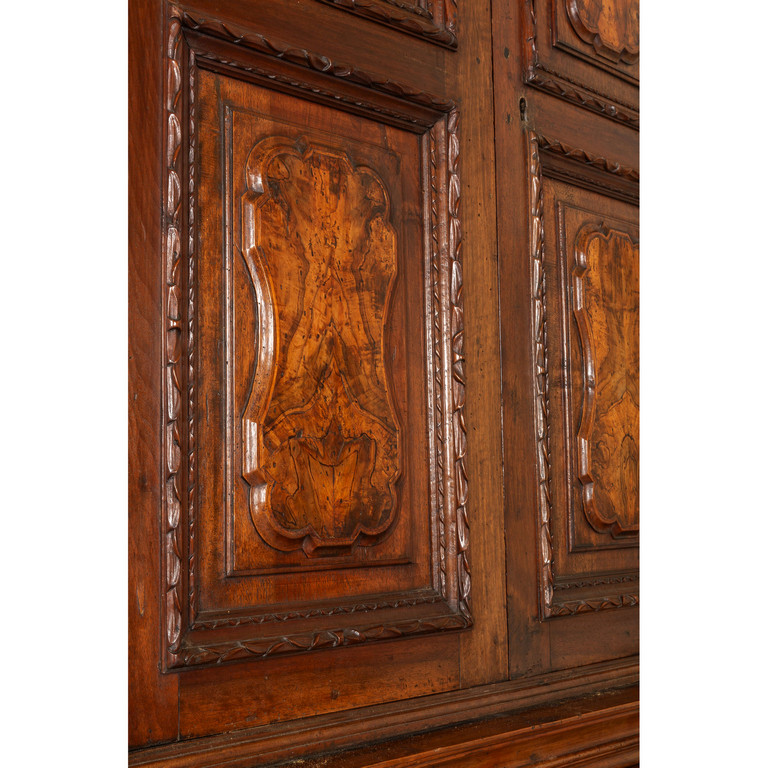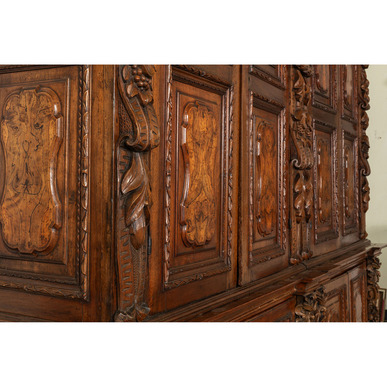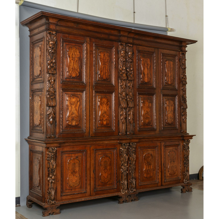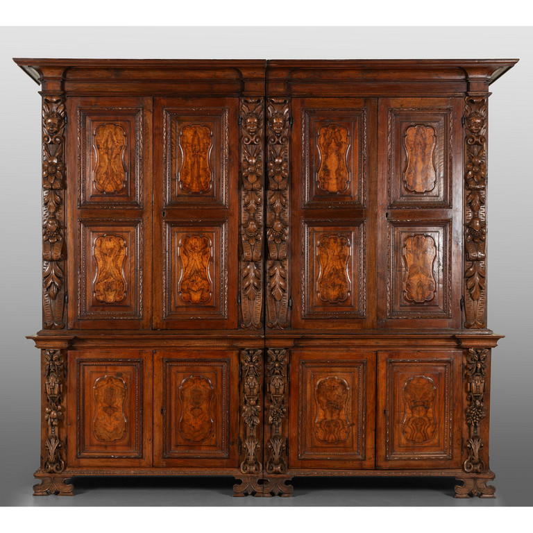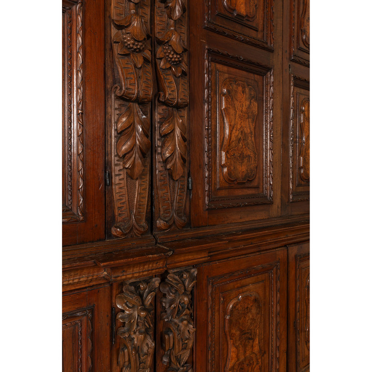 Grande libreria in noce ad otto sportelli intarsiata in radica montanti intagliati con figure di angeli Bergamo sec.XVII