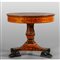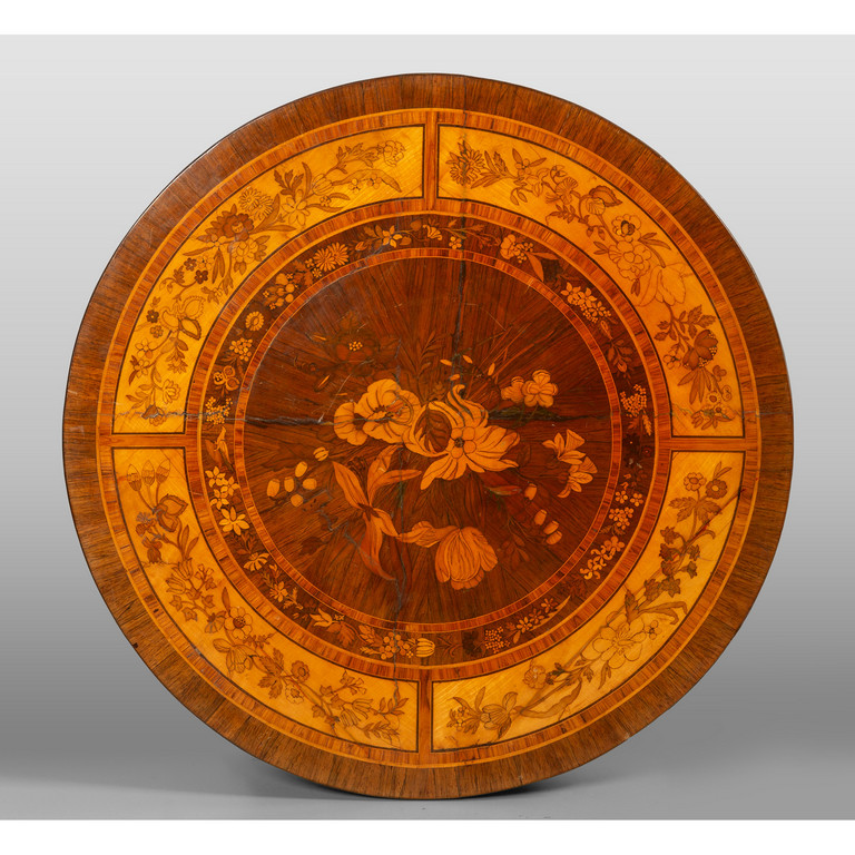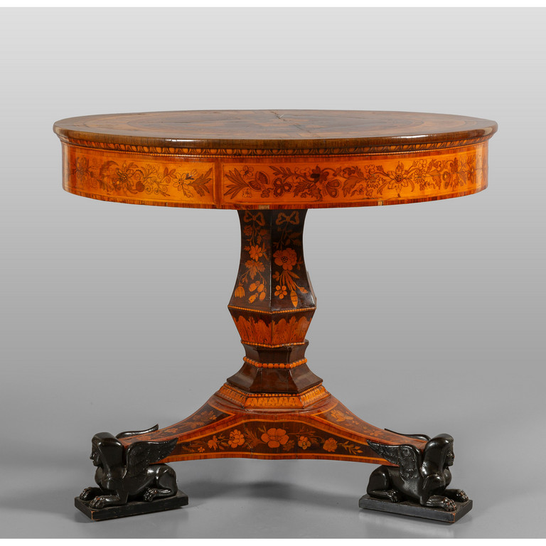 Eccezionale tavolo Carlo X di forma rotonda poggiante su tre piedi a forma di sfingi lastronato e finemente intarsiato a motivi floreali Roma sec.XIX