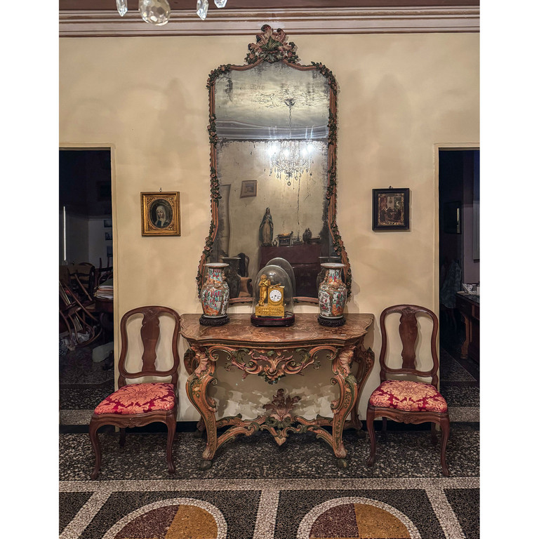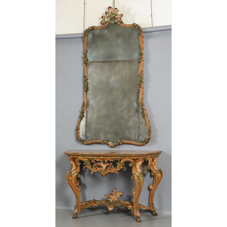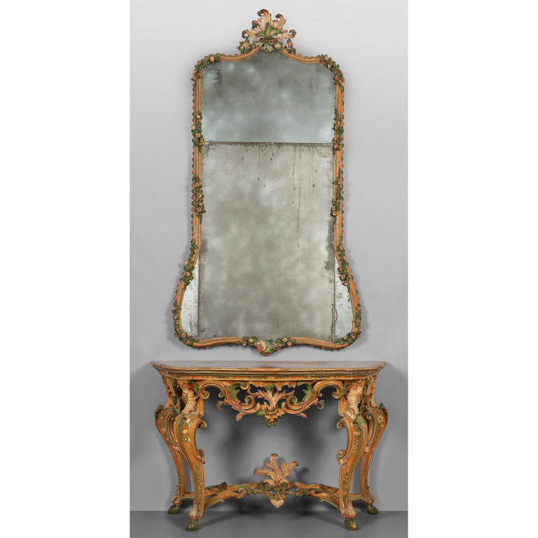 Console Luigi XV con piano in diaspro e specchiera analoga in legno intagliato e laccato in policromia a fiori Genova sec.XVIII (laccatura di epoca posteriore)