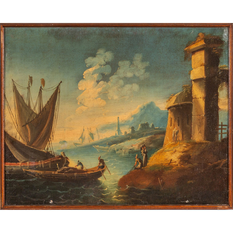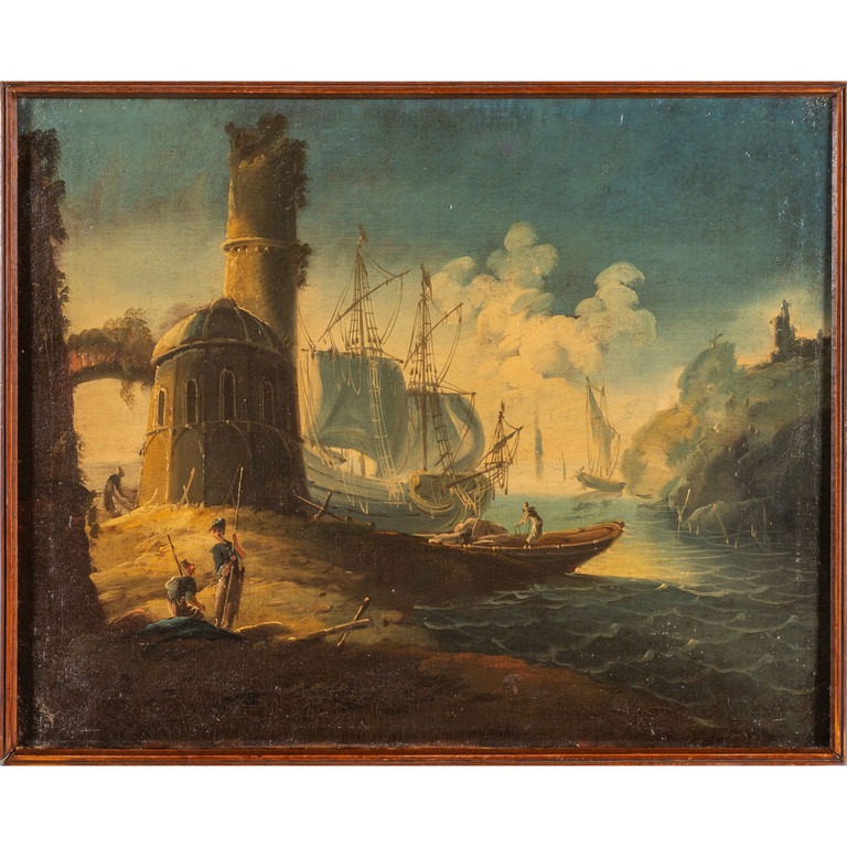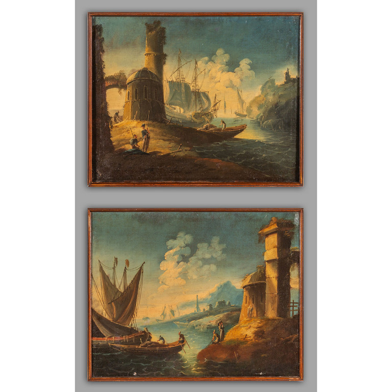 Scuola piemontese sec.XVIII (Antoniani) 'Paesaggi animati con figure e barche' coppia di olii