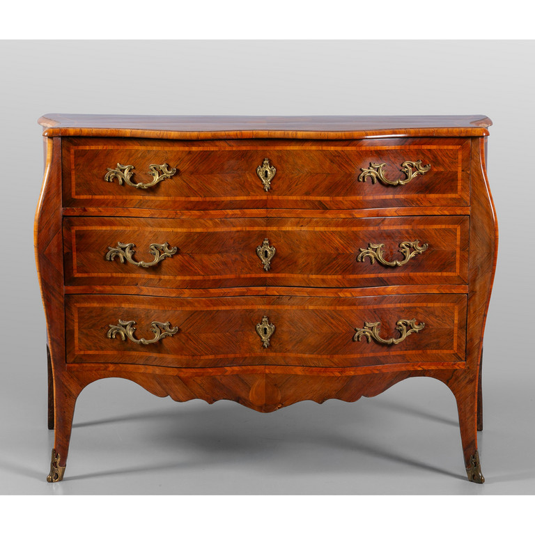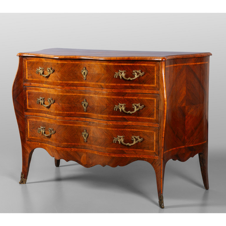 Comò Luigi XIV lastronato in palissandro doppia mossa sul fronte e movimentato sui fianchi Genova sec.XVIII