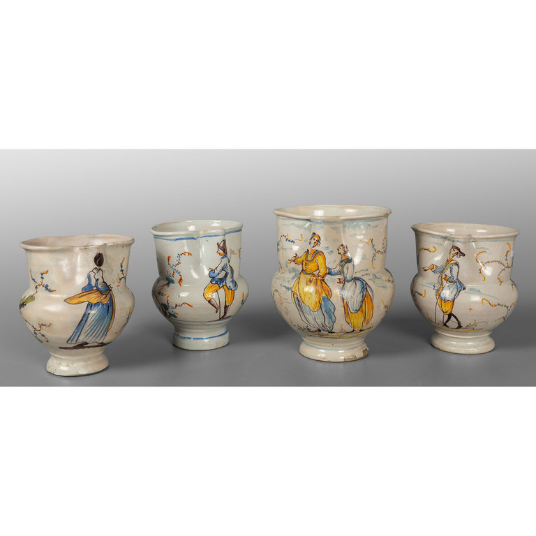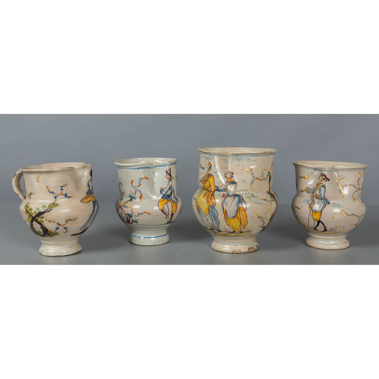 Quattro versatoi in ceramica decorati con personaggi in policromia Savona sec.XVIII