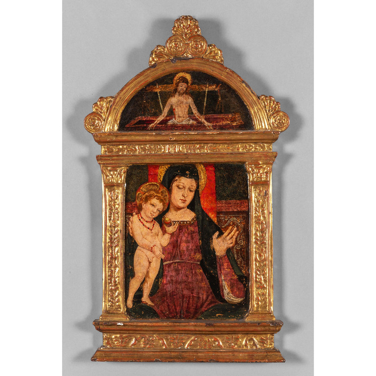 Scuola veneta sec.XVI 'Madonna con Bambino' anconetta parte superiore con Cristo Risorto
