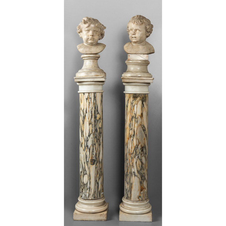 Coppia di teste in marmo statuario raffiguranti fanciulli poggianti su colonne in breccia sec.XIX