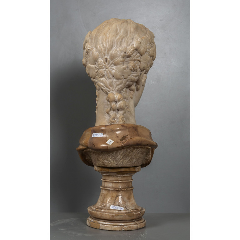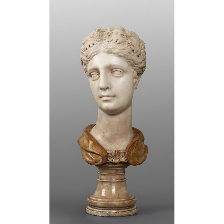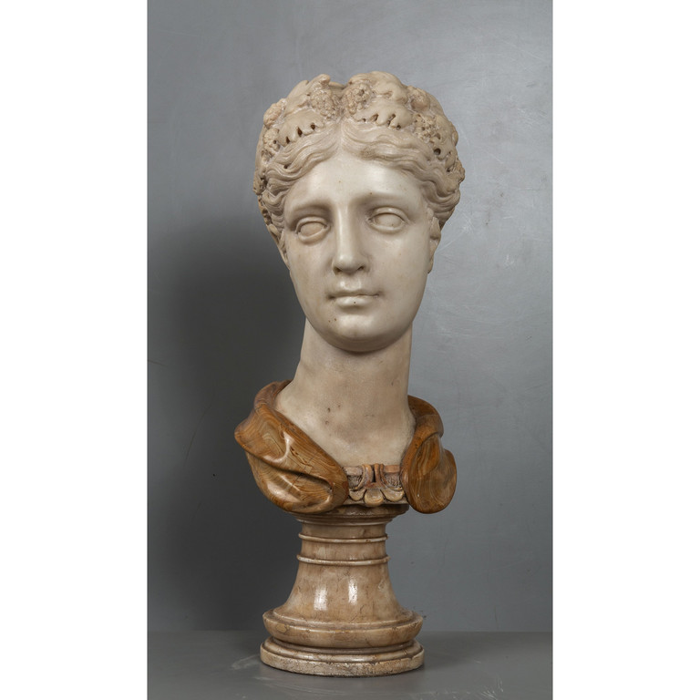 Flora testa di scultura a tutto tondo in marmo statuario sec.XVII/XVIII su base non coeva in alabastro e breccia sec.XIX
