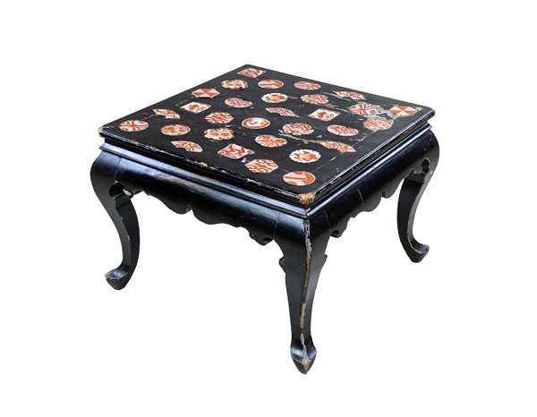 Tavolino in legno verniciato nero, piano con inserti in porcellana dipinta con figurine ed elementi naturalistici in rosso ed oro. Cina, secolo XX (cm 63x45x63) (difetti e mancanze)