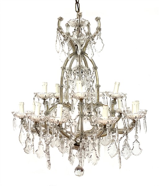 Lampadario a sedici luci in stile Maria Teresa con struttura in metallo rivestito in vetro, bracci raccordati da catenelle e pendenti sagomati (h cm 95 più catena, d cm 80) (difetti e piccole mancanze)