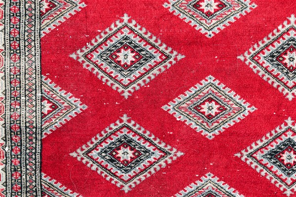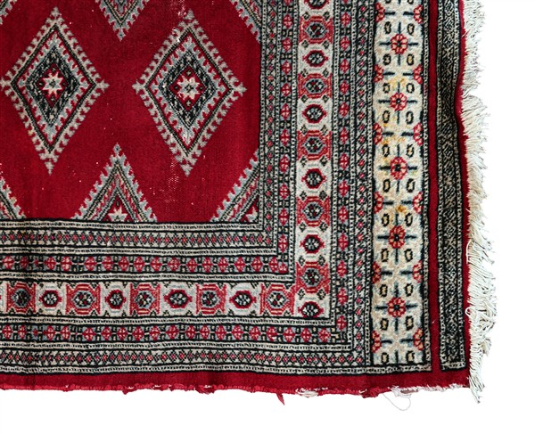 Tappeto Boukhara, Pakistan, secolo XX. Decoro con Memling Gul su fondo rosso (cm 186x124) (difetti e rapature)