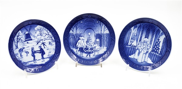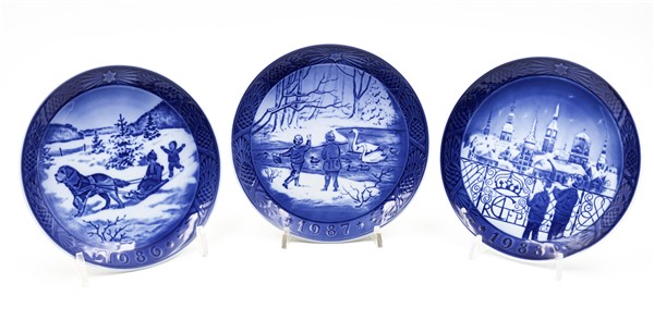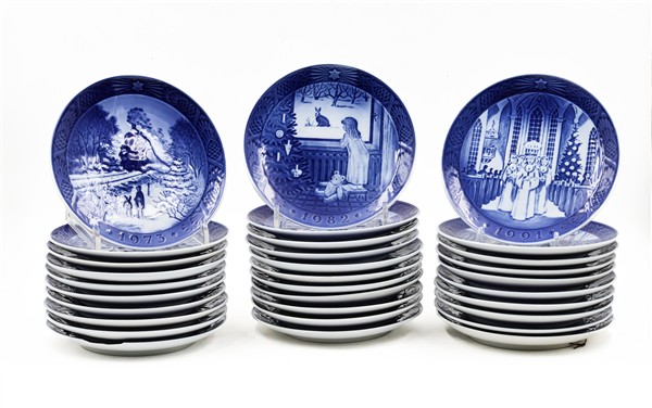 Manifattura Royal Copenhagen. Gruppo di trentuno piatti in porcellana decorata in monocromo blu con annali (difetti)