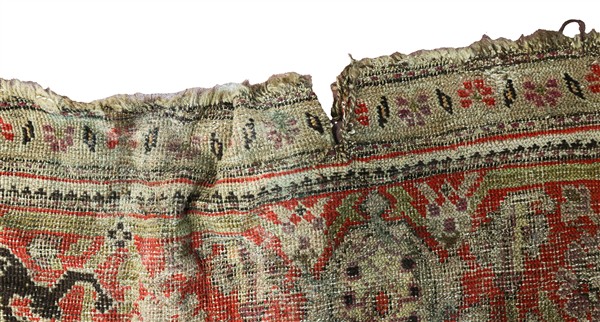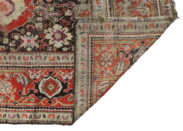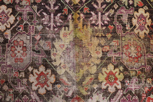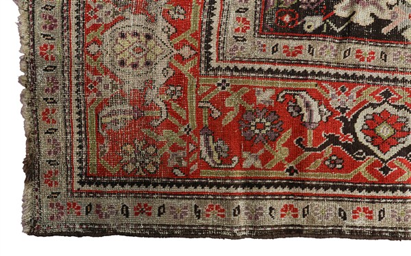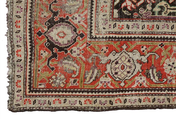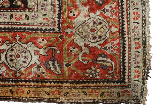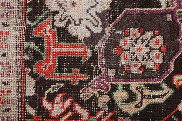 Tappeto galleria Karahbagh, Caucaso, 1880 circa. Decoro all-over del tipo Harshang con palmette, piccoli medaglioni e rami fioriti su fondo marrone (cm 550x197) (difetti, rapature e macchie)