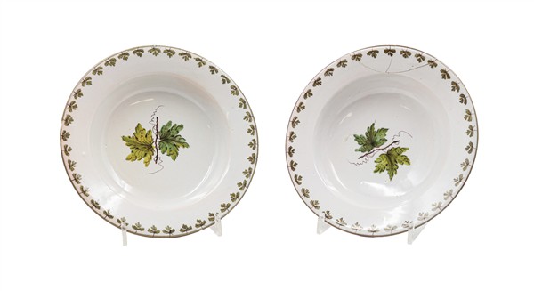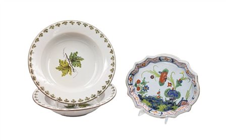 Manifattura di Faenza, secolo XVIII-XIX. Lotto composto da due piatti fondi in maiolica dipinta a foglie di vite e un piccolo vassoio mistilineo decorato al "garofano" (d max cm 23,5) (difetti e restauri)