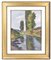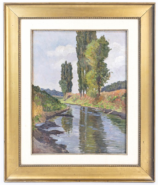 Ignoto del secolo XX "Scorcio fluviale con pioppi" olio su compensato (cm 45x