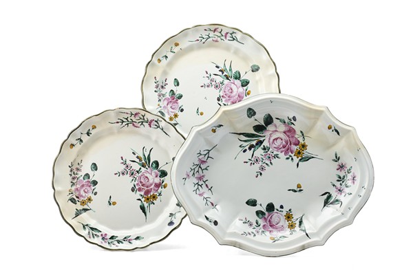 Manifattura di Ferniani, Faenza, seconda metà del secolo XVIII. Lotto composto da un vassoio e due piatti in maiolica dipinta in policromia ''alla rosa'' (cm max 32x26) (restauri)