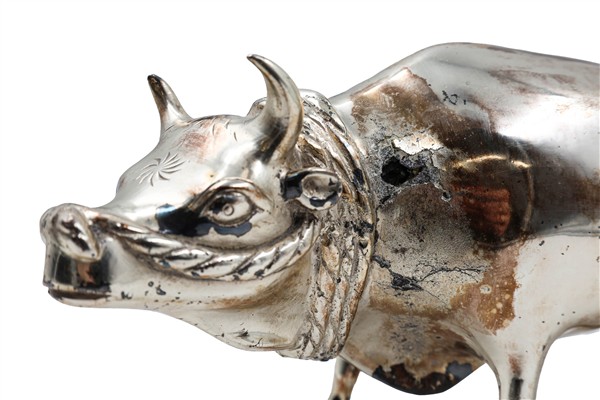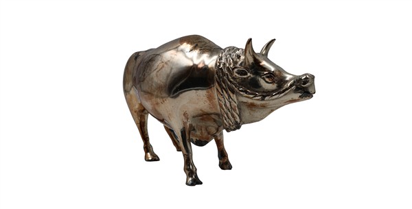 Scultura in bronzo fuso e argentato raffigurante bue (cm 24x14) (difetti di fusione)