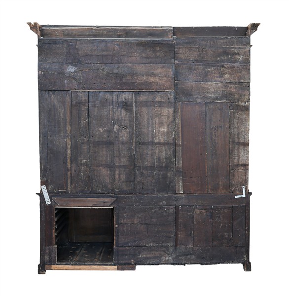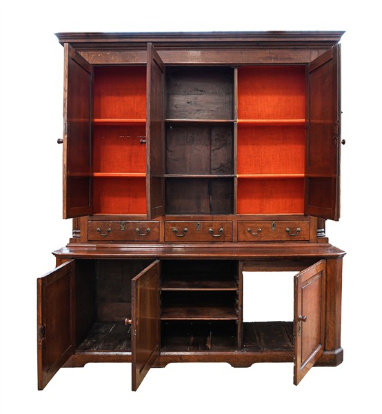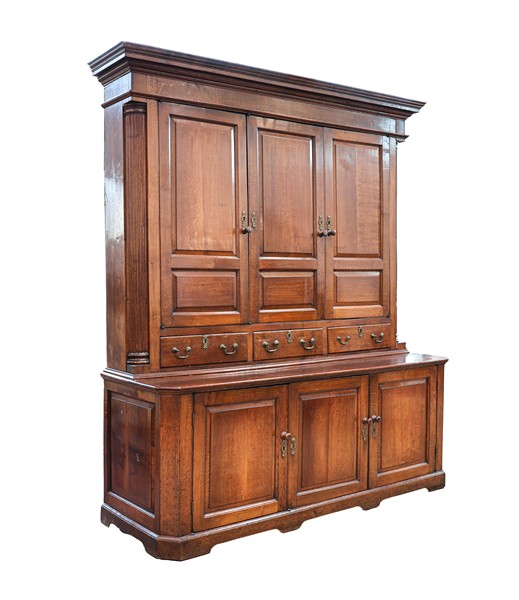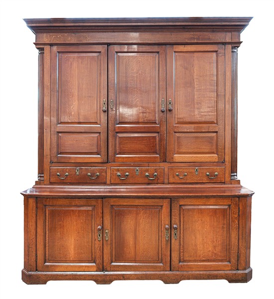 Mobile a due corpi in rovere, parte superiore a tre ante pannellate e tre cassetti, montanti a semi colonna scanalata. Parte inferiore a tre ante pannellate con profili scantonati. Cappello aggettante. Inghilterra, secolo XIX (cm 203x232x64) (difetti e modifiche alla schiena)