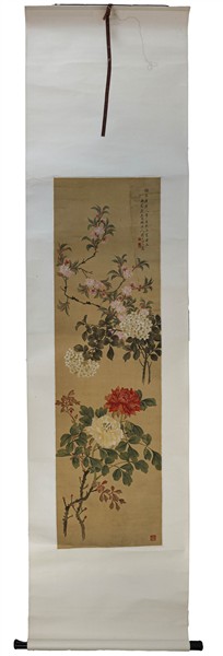 Due scroll, inchiostro su seta, uno raffigurante fiori, l'altro raffigurante ba