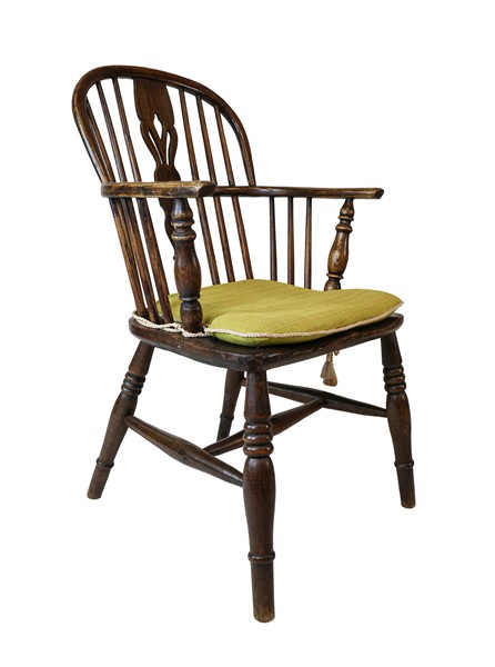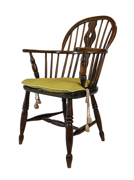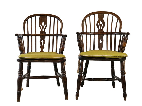 Coppia di poltrone in stile Windsor con gambe e montanti torniti, schienali a listelli ed cartelle sagomate e traforate. Inghilterra (difetti)