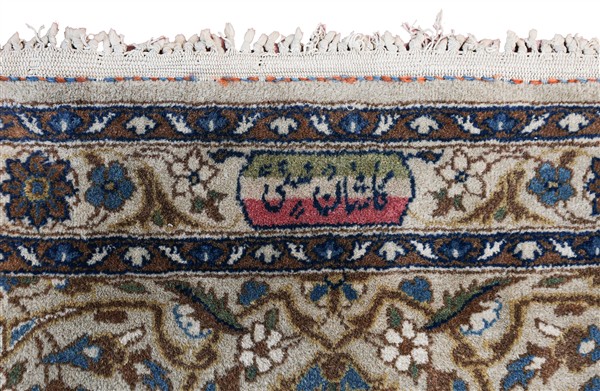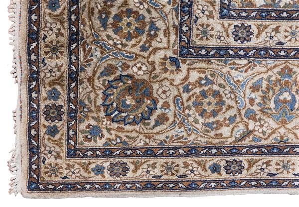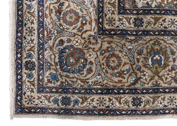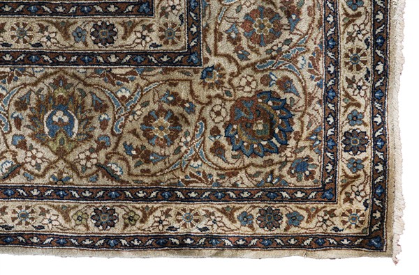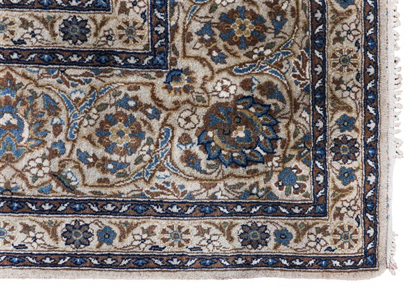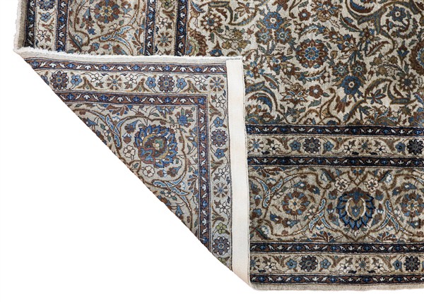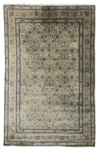 Tappeto Keshan, Persia, prima metà secolo XX. Decoro all over nei toni dell'azzurro, blu, nocciola e verde su fondo bianco (cm 351x236) (difetti)