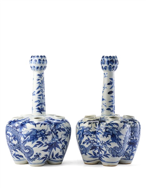 Coppia di vasi per tulipani, in porcellana bianca e blu, il corpo polilobato con cinque aperture, centrate da un lungo collo cilindrico con la bocca modellata a fiore di loto, il corpo dei vasi decorati da draghi e motivi floreali, recanti alla base marchio apocrifo Qianlong