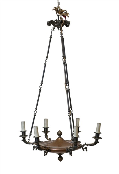 Lampadario in stile Impero in rame e metallo a sei luci con bracci a voluta raccordati da catenelle (h. cm 80) (difetti)