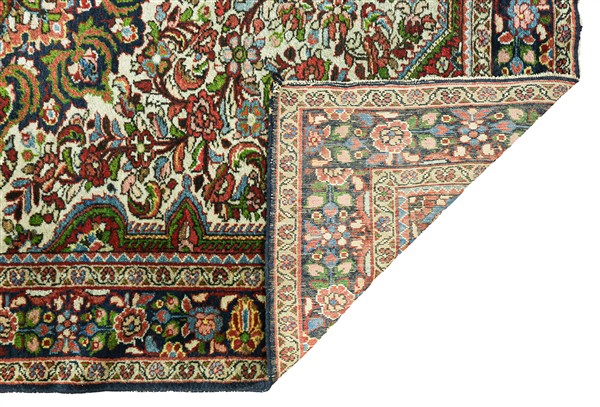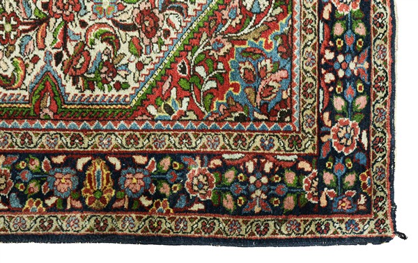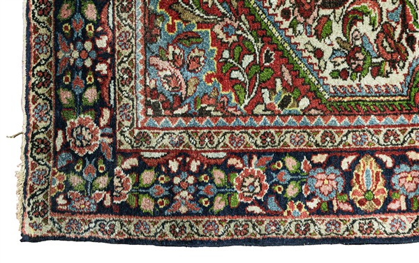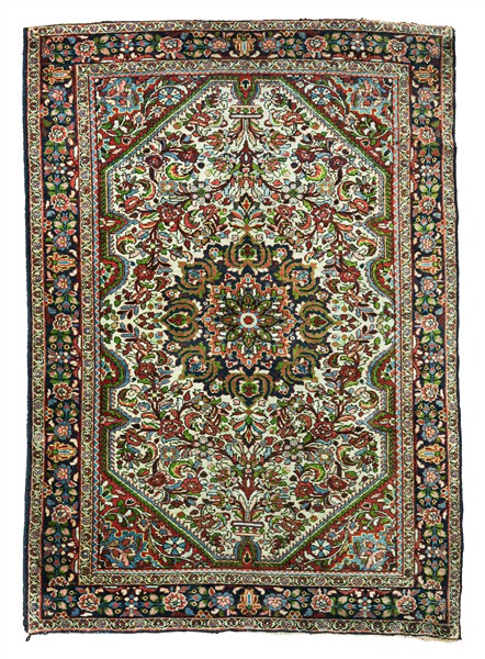 Tappeto Malayer, Persia, secolo XX. Decoro con medaglione polilobato su campo bianco, decorato con rami fioriti policromi (cm 192x136) (difetti)