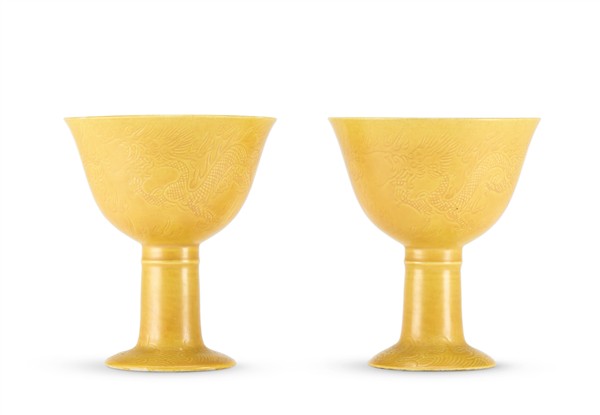 Coppia di stem cup in porcellana con invetriatura gialla decorate con draghi. R
