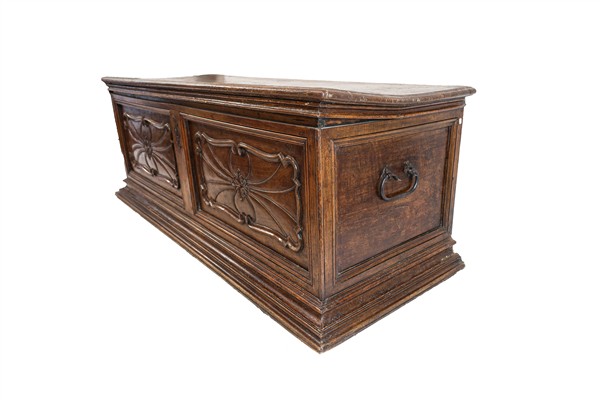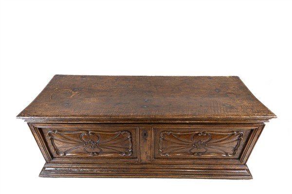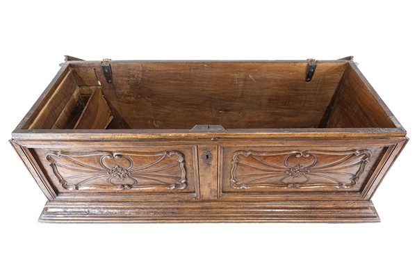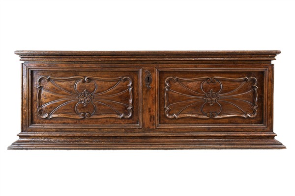 Cassapanca in noce con fronte decorato da doppia pannellatura intagliata a ragn