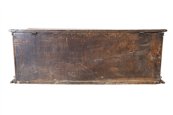 Cassapanca in noce con fronte decorato da doppia pannellatura intagliata a ragnatela entro riserva. Piemonte, secolo XVIII (cm 170x60x64) (difetti e restauri)