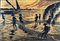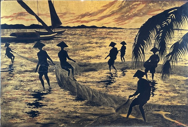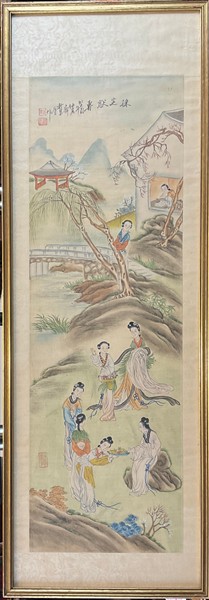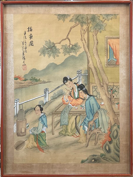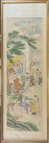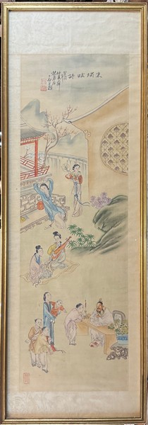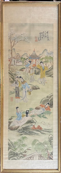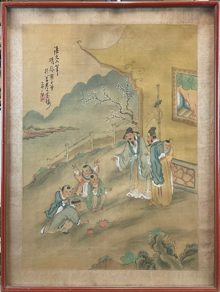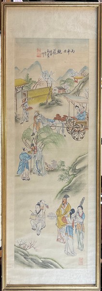 Lotto composto da nove diversi pannelli in carta di riso dipinta in policromia con scene di vita, in cornice (cm max totali 79x27,5) e un pannello in legno decorato in oro e nero raffigurante scena con pescatori (cm 61x90) firmato in basso a destra. Arte orientale, secolo XX (difetti)