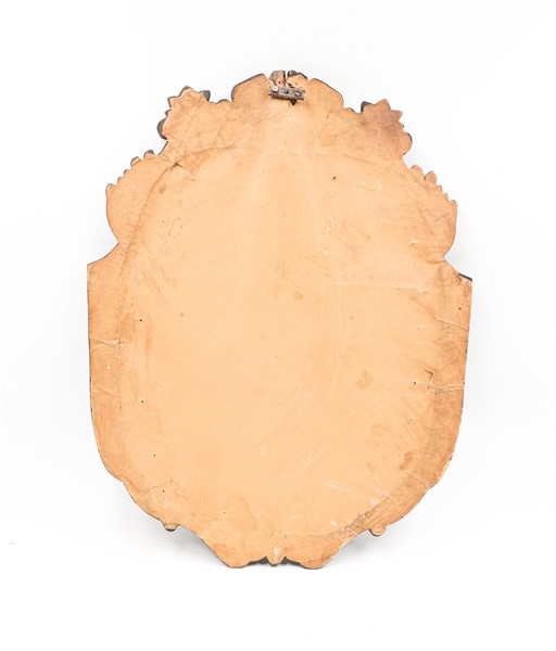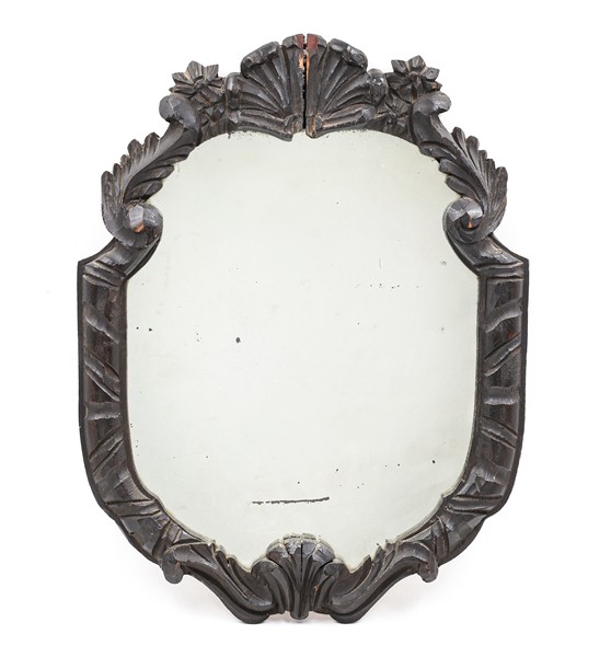 Specchiera di forma sagomata con cornice in legno intagliato a volute ed elementi stilizzati (cm 46x38) (difetti)