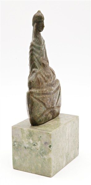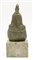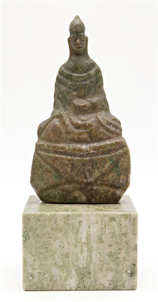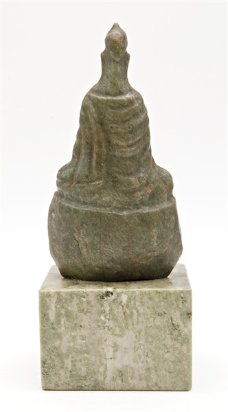 Intaglio raffigurante Buddha assiso, le mani in gesto di bhumisparsha mudra, in pietra dura verde, su base quadrata in pietra