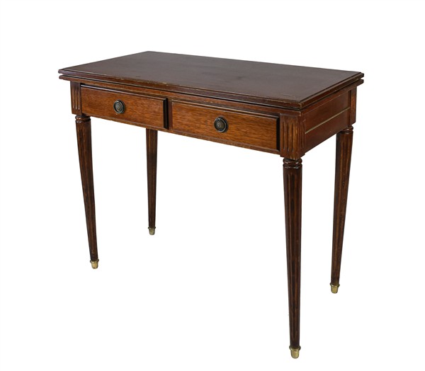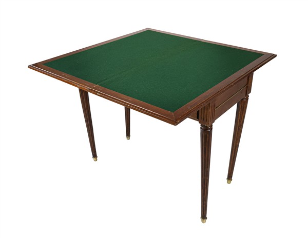 Tavolino da gioco in mogano con due cassetti nella fascia, piano ribaltabile con panno verde e gambe scanalate con piedini in metallo dorato (cm chiuso 90x74x45) (difetti)