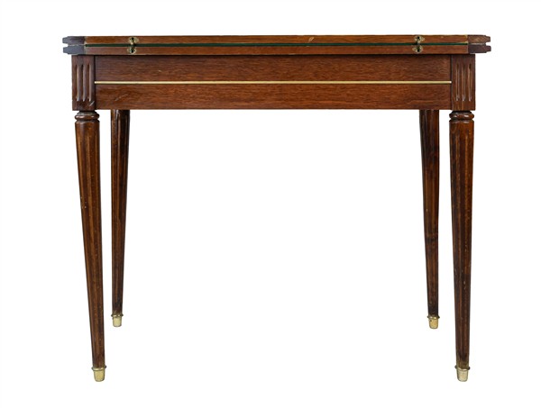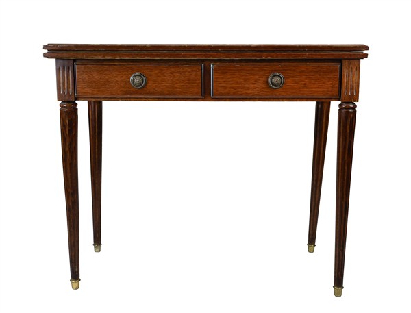 Tavolino da gioco in mogano con due cassetti nella fascia, piano ribaltabile co